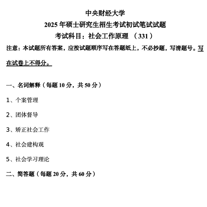 中财中央财经大学331社会工作原理2025(无答案).pdf