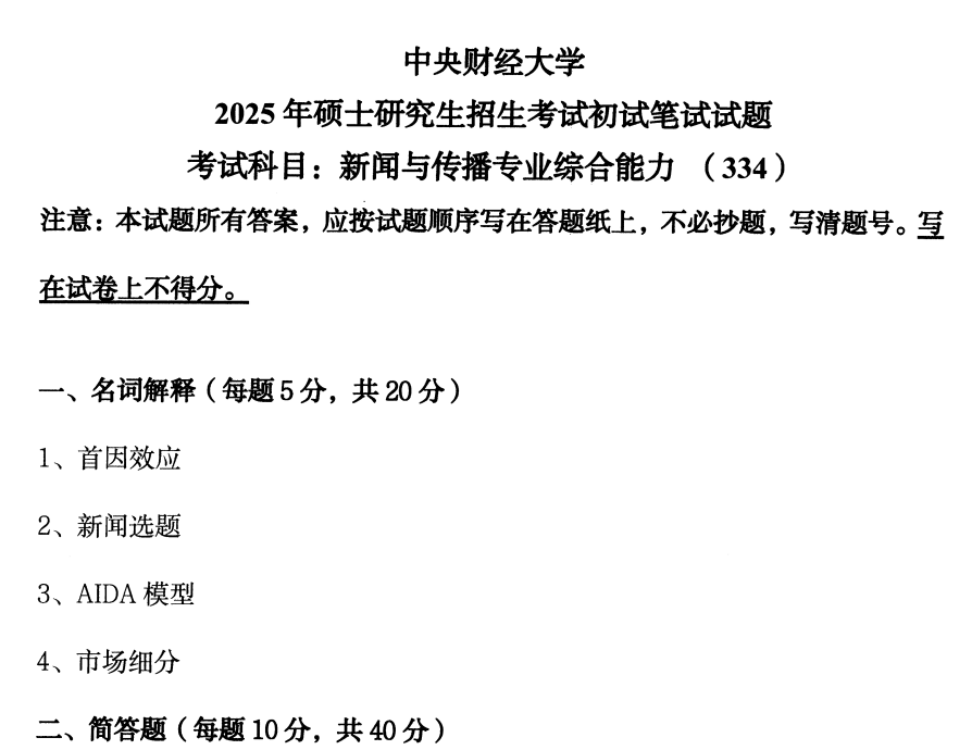 中财中央财经大学334新闻与传播专业综合能力2025(无答案)考研真题