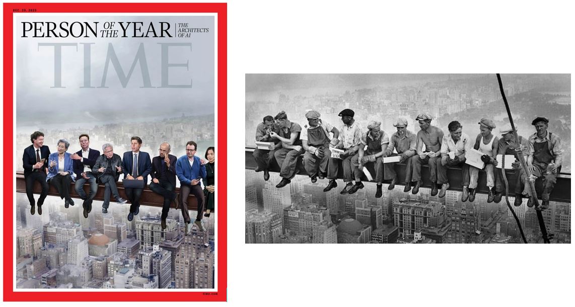 《时代》杂志将“AI 的设计师们”评为年度风云人物,颇具象征意义。年度封面致敬的是 1932 年那张著名的《摩天大楼工人午餐》照片——在大萧条的阴影下,美国建筑工人悬坐高空,向世界宣告:美国的建设在继续,美国梦仍将延续。