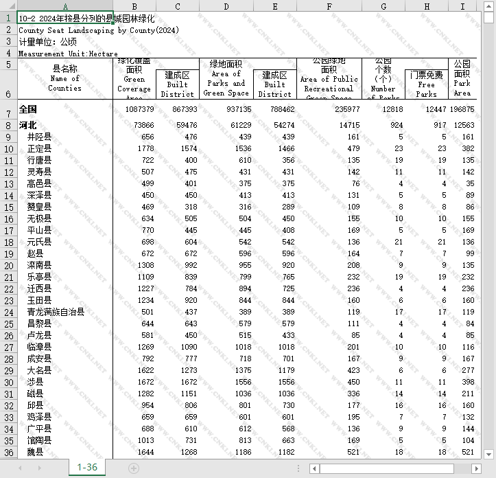 2015-2024年按县分列的县城园林绿化建成区绿化覆盖公园绿地面积门票免费个数
