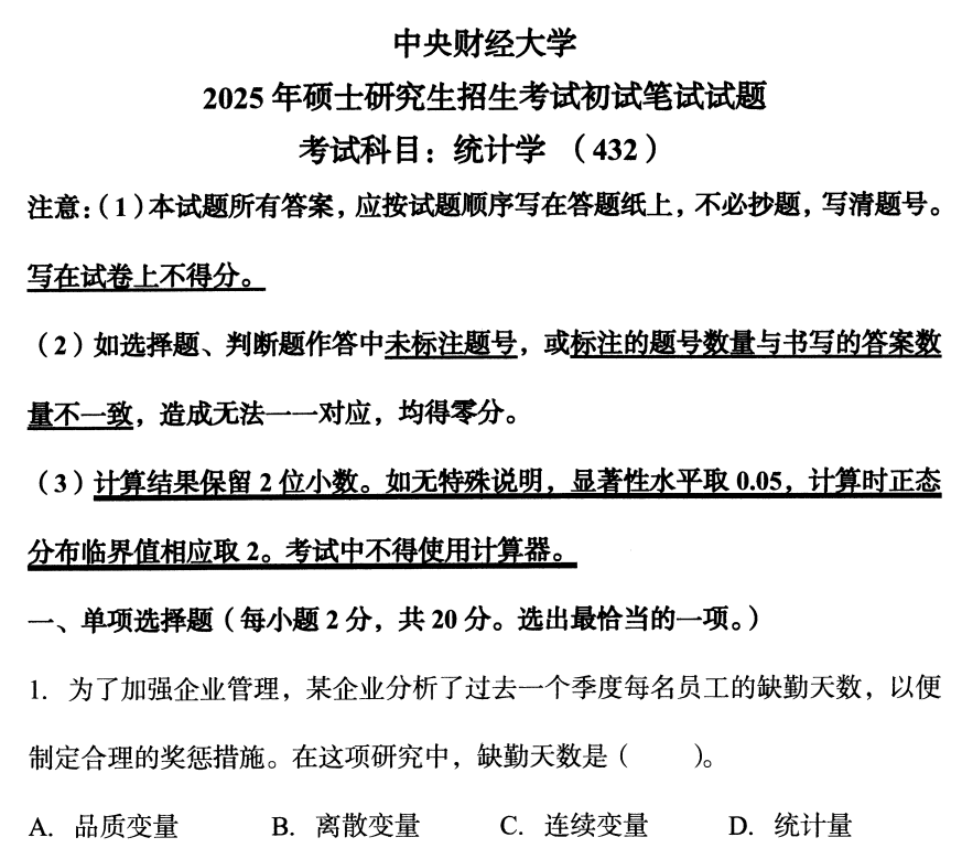 中财中央财经大学432统计学2025(无答案).pdf