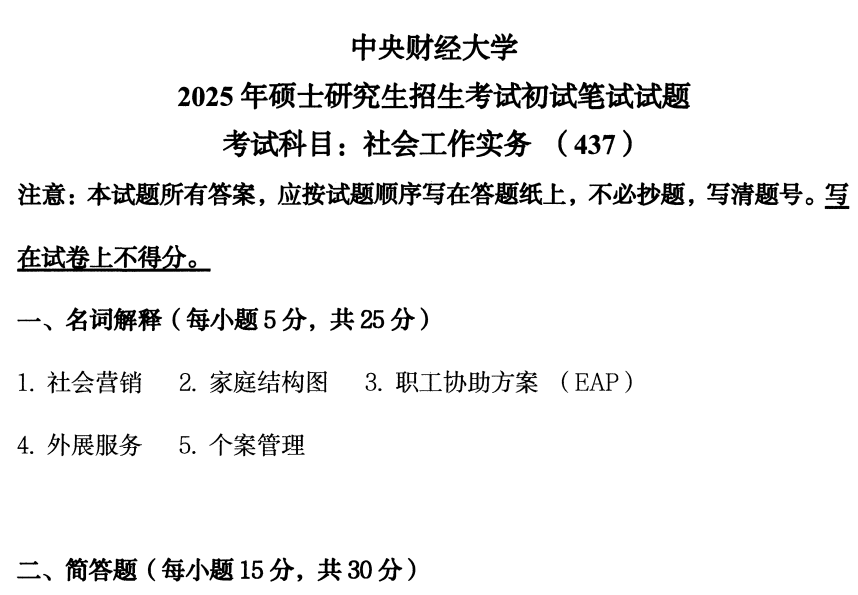 中财中央财经大学437社会工作实务2025(无答案)考研真题