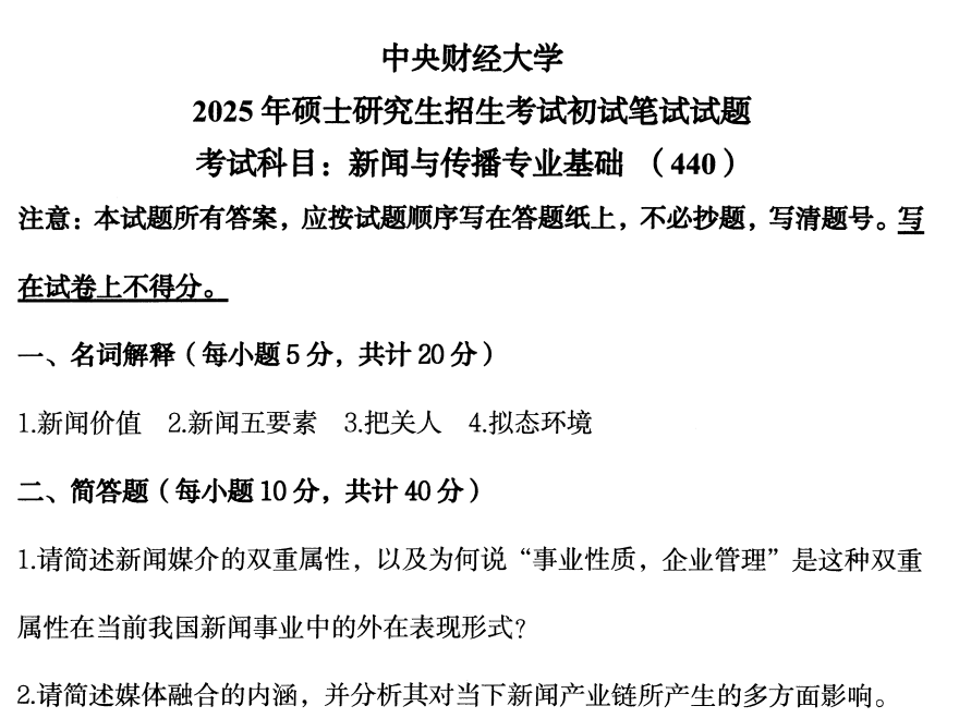 中财中央财经大学440新闻与传播专业基础2025(无答案)考研真题