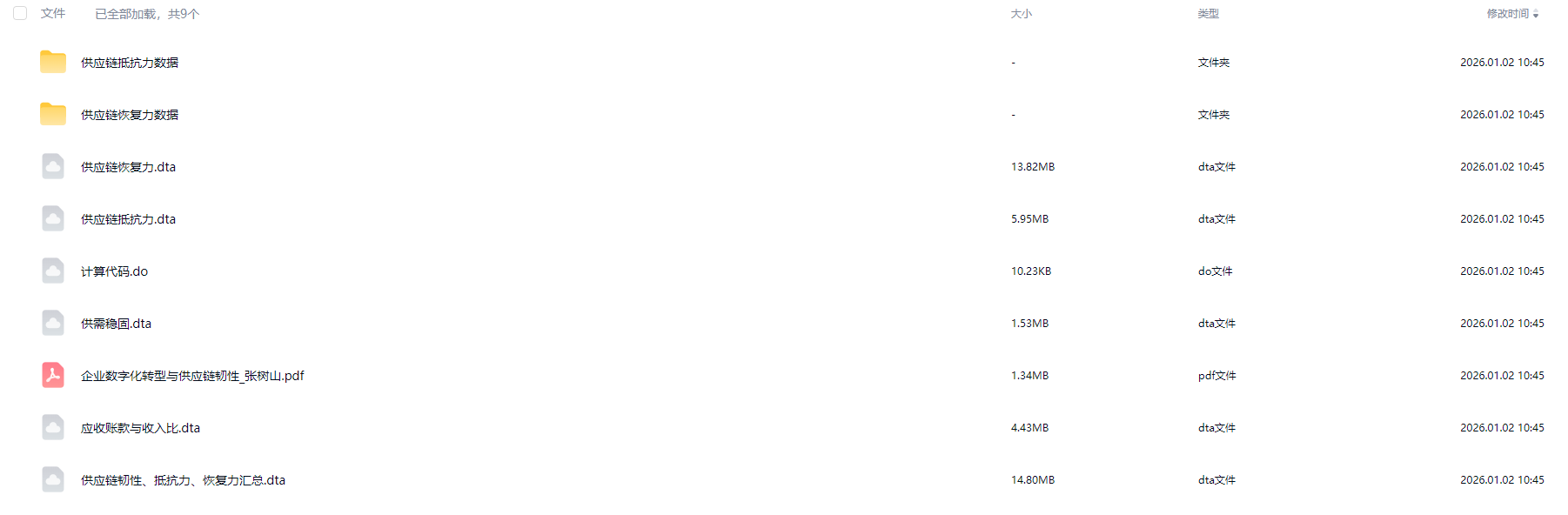 参考张树山、谷城(2024)从供应链抵抗力、恢复力两个维度,选取应收账款与收入比、前五大客户、库存周转率等财务与经营数据,构建上市公司供应链韧性指标体系,并运用熵值法测算供应链抵抗力、恢复力及供应链韧性。本数据包含原始数据、计算代码、参考文献、最终结果