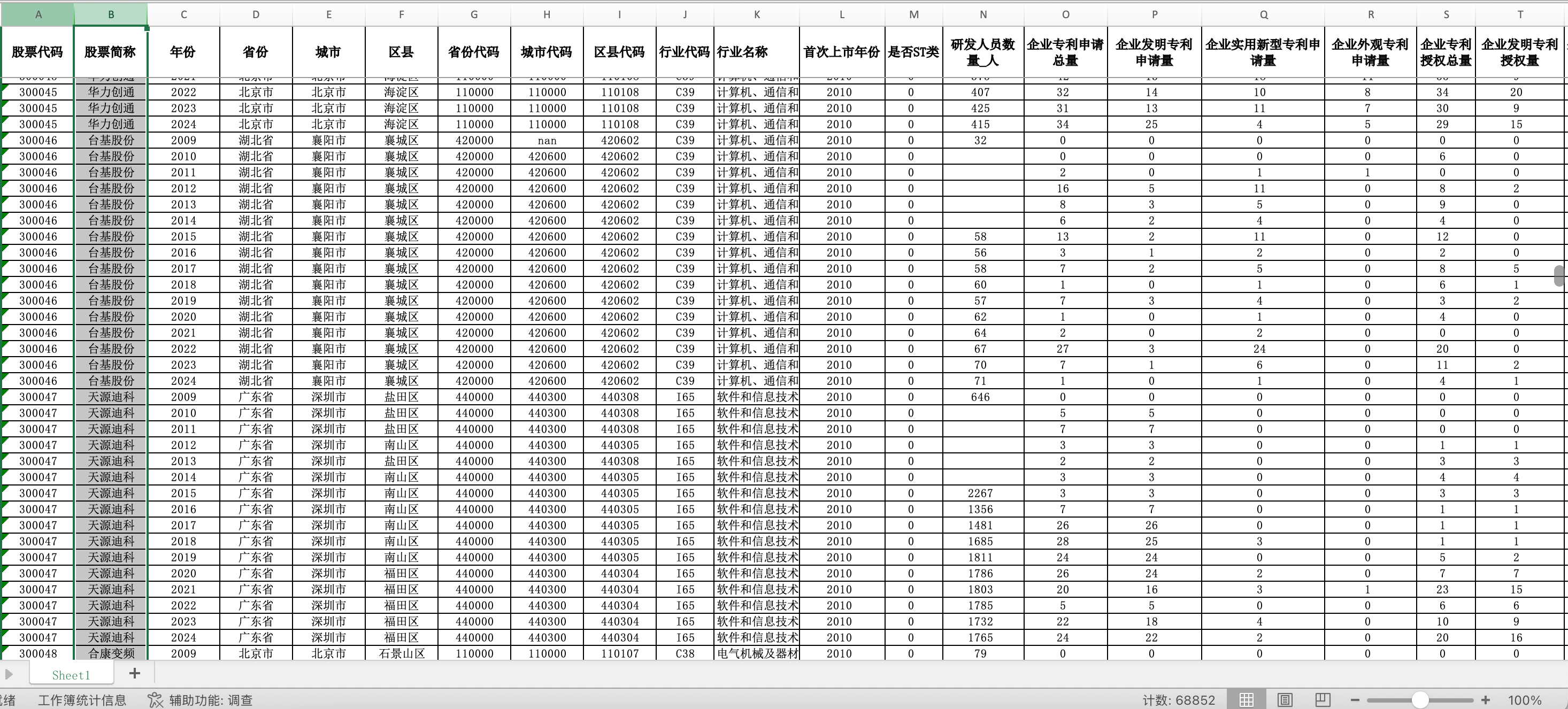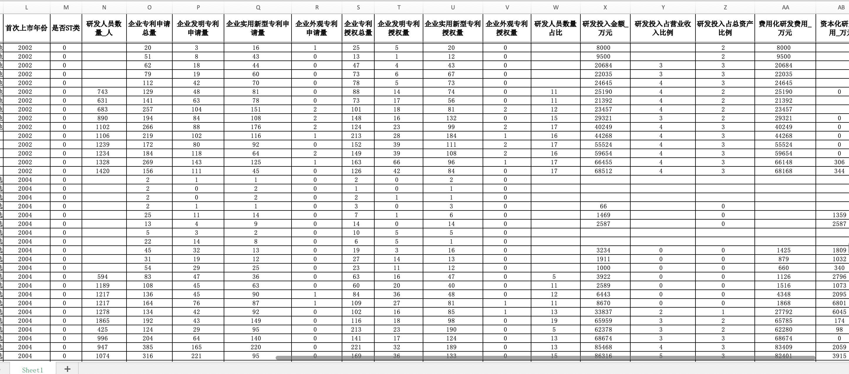 数据说明:系统整合上市公司年度研发投入信息与专利申请、授权数据,涵盖费用化与资本化研发支出、研发人员配置以及多类型专利产出指标,用于刻画企业创新“投入—产出—结构”特征。
