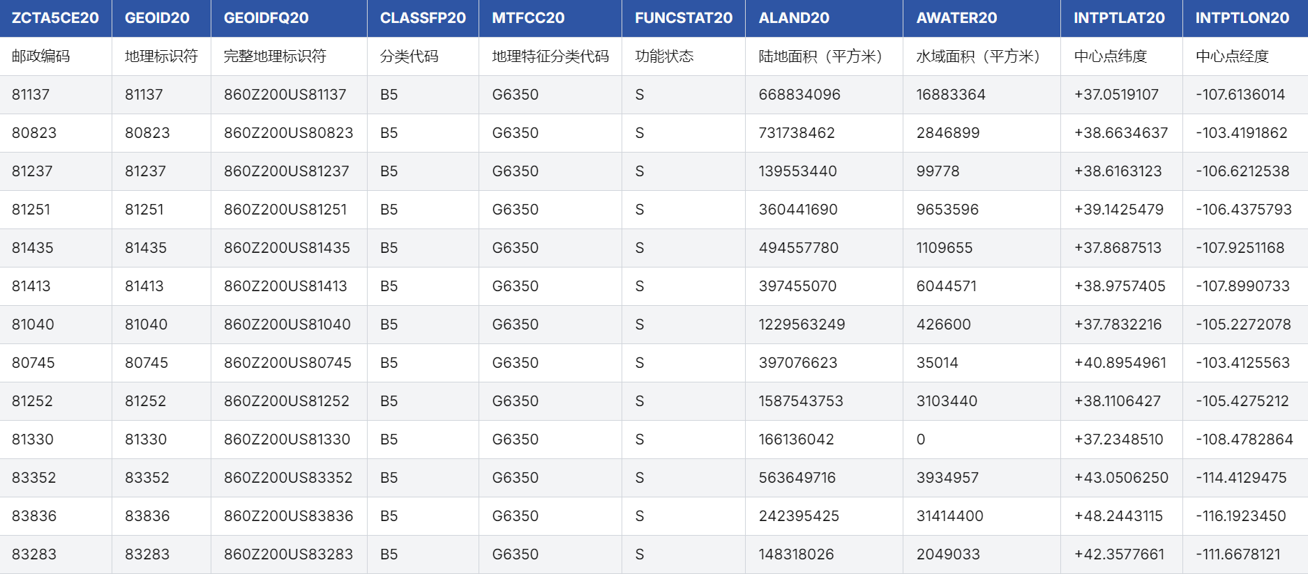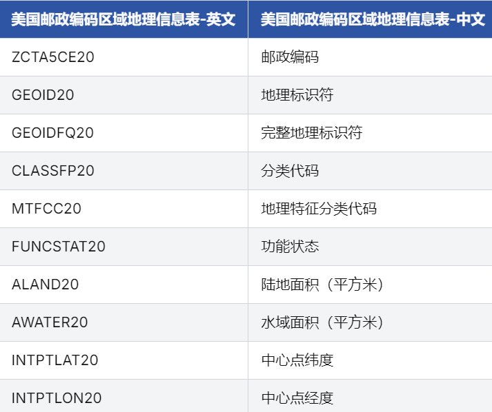 - 地理信息完整,支持精细化分析:除基础邮政编码外,还提供地理唯一标识符(GEOID20)、功能状态、陆地与水域面积及经纬度坐标,用户可结合地理信息系统(GIS)进行精确的空间计算与可视化。