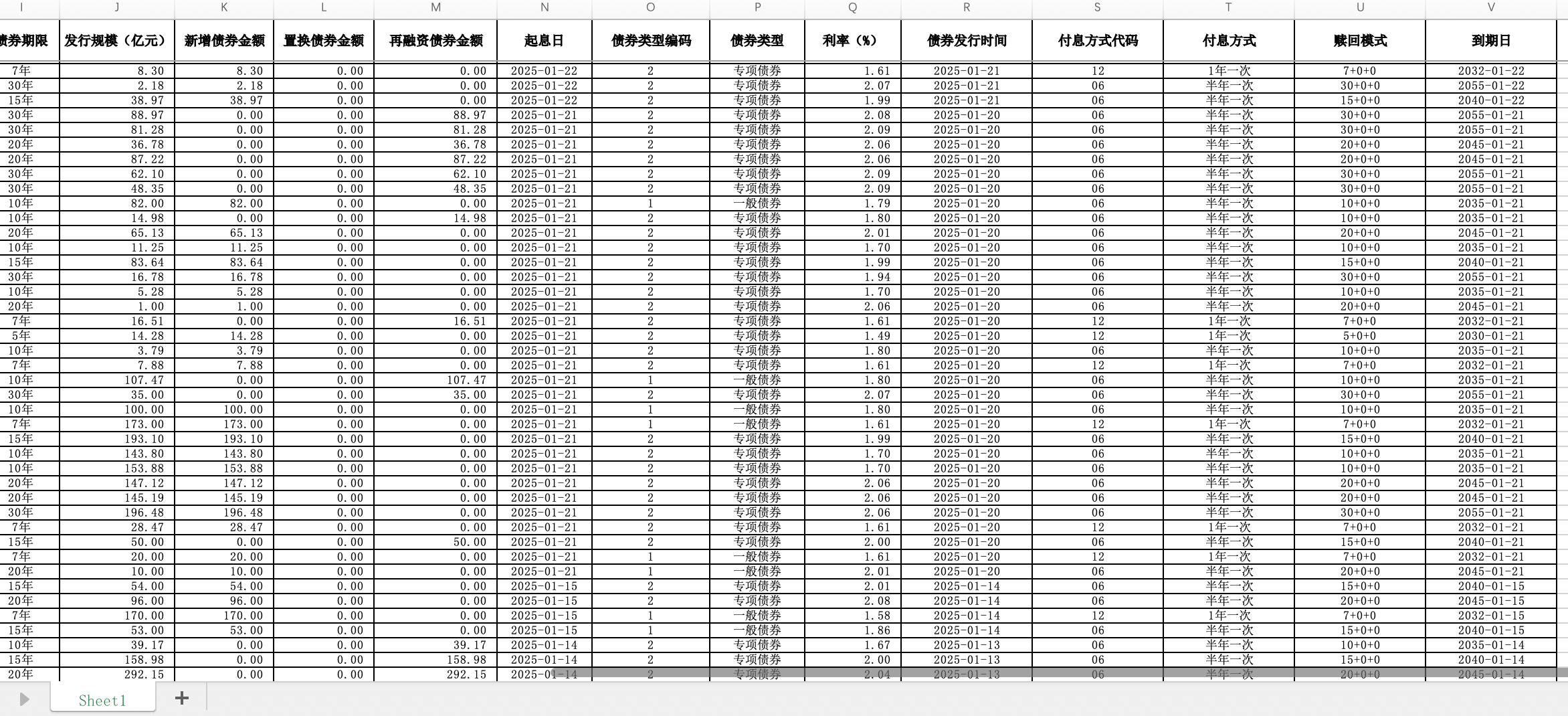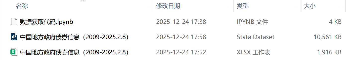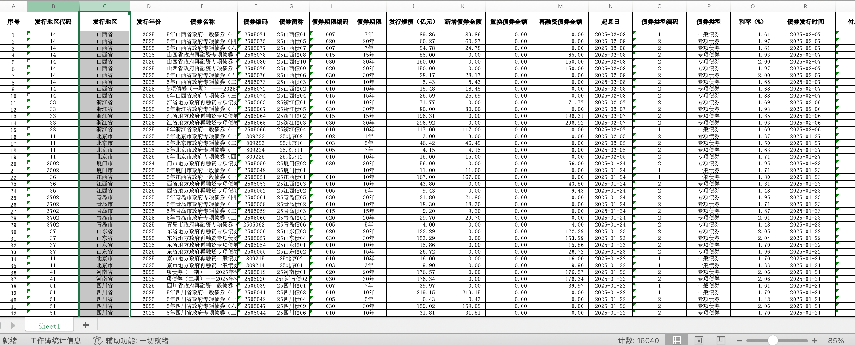 地方政府债券是我国地方财政运行和基础设施投融资体系中的核心工具,承担着稳投资、补短板、防风险的重要职能。系统整理地方政府债券的发行规模、期限结构和利率水平等信息,有助于从区域和时间维度分析地方财政状况、债务结构演变及其宏观经济影响。