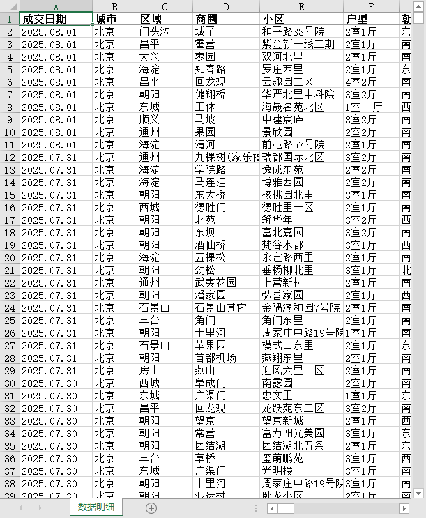 北京市商品房二手房成交数据2025-2019区县商圈小区户型朝向楼层面积成交成交单价等