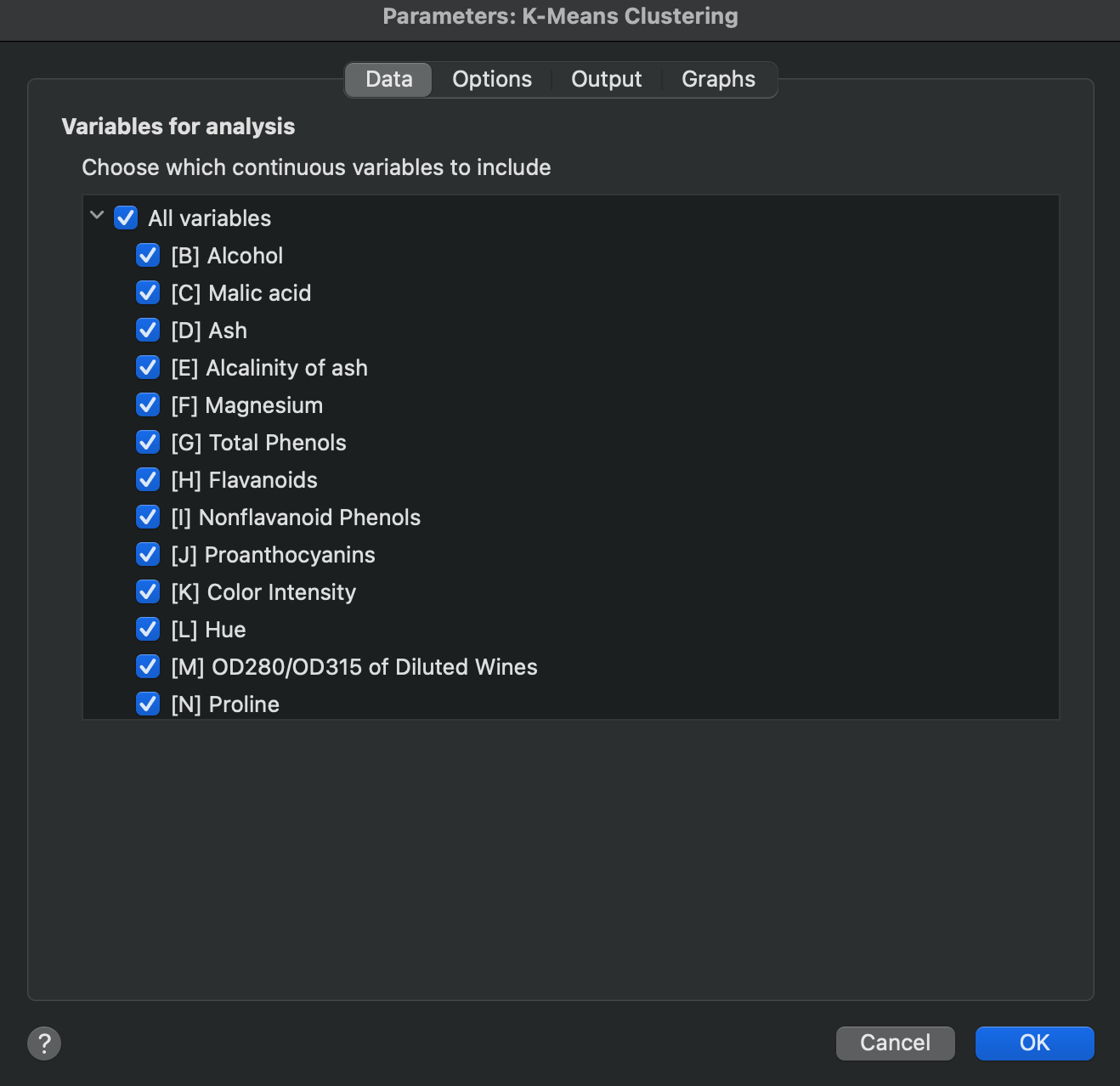 Prism中的K-均值聚类通过计算观测值(行)之间的距离,将观测值(行)分配至不同聚类。这些距离是利用分析中纳入的所有变量(列)对应的每行数值计算得出。分析参数对话框的此选项卡可让您指定哪些变量(列)应纳入分析,以及哪些(若有)应排除。