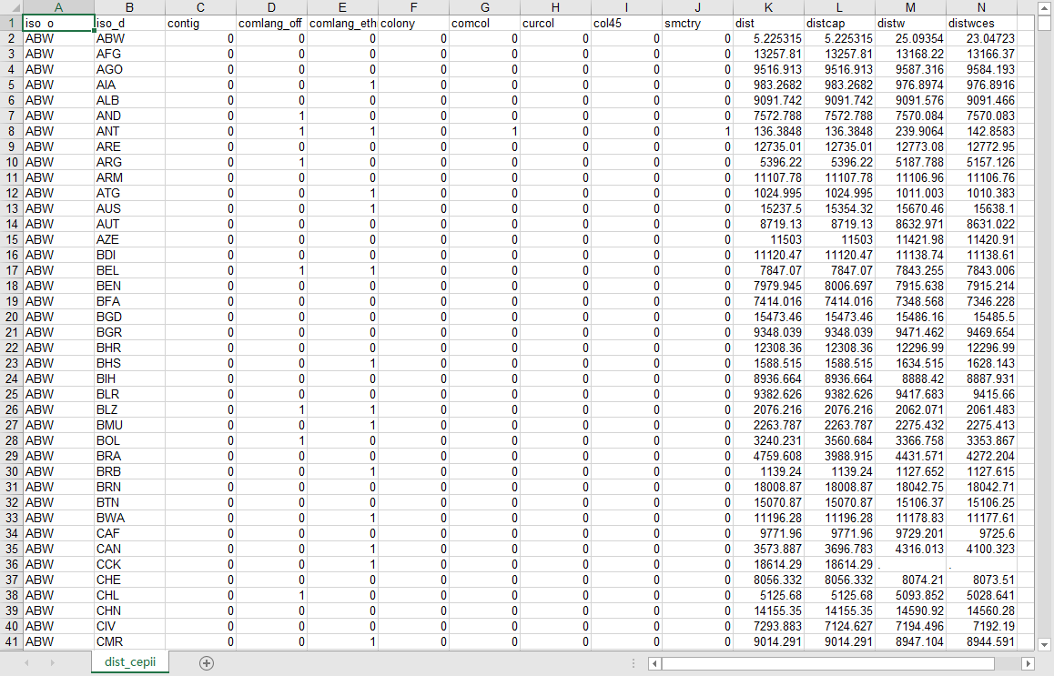 iso_o iso_d contig comlang_off comlang_ethno colony comcol curcol col45 smctry dist distcap distw distwces