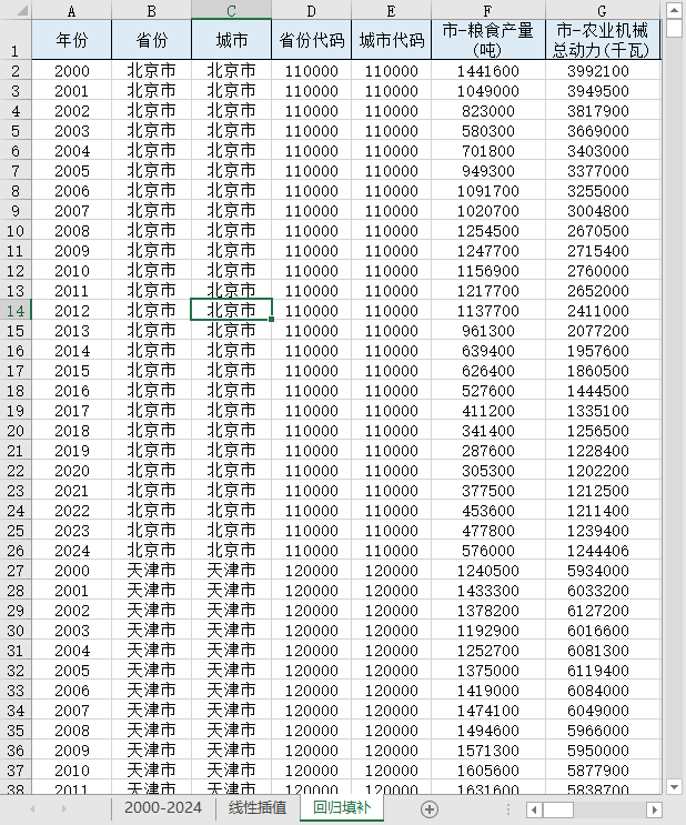 年份 省份 城市 省份代码 城市代码 "市-粮食产量(吨)" "市-农业机械总动力(千瓦)" "市-农用化肥施用量_折纯(吨)" "市-农作物总播种面积(公顷)" "市-粮食播种面积(公顷)" "市-总产值_农、林、牧、渔业(万元)" "市-总产值