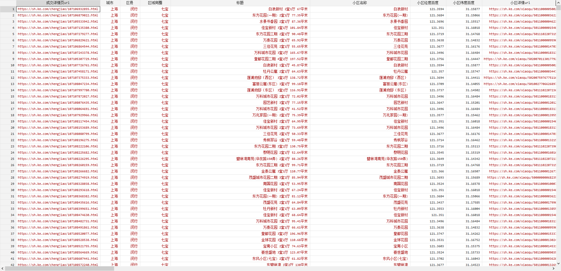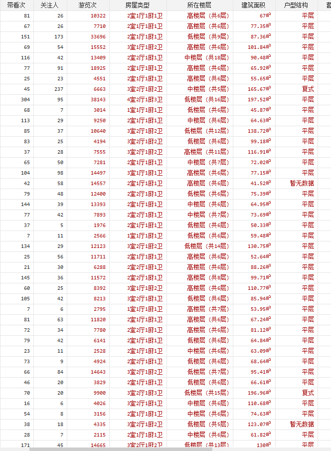成交详情页url 城市 区县 区域商圈 标题 小区名称 小区经度(百度) 小区纬度(百度) 小区详情url 挂牌时间 成交时间 成交价格/万 成交均价 元/平 挂牌价格/万 成交周期/天 调价/次 带看/次 关注/人 游览/次 房屋类型 所在楼层 建筑面积 户型结构 套内面积 建筑类型 房屋朝向 建成年代 装修情况 建筑结构 供暖方式 梯户比例 配备电梯 lian家编号 交易权属 房屋用途 房屋年限 房屋权属