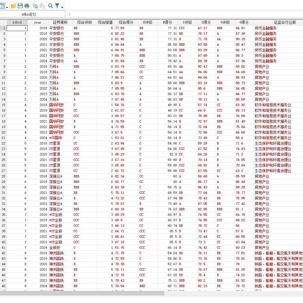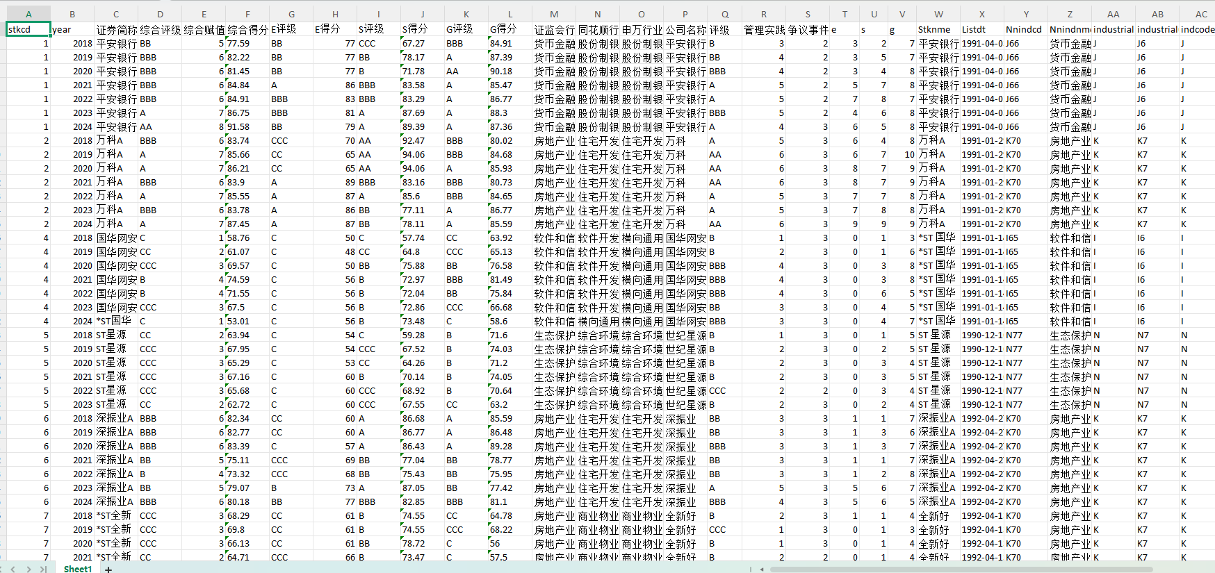 3、指标:stkcd、year、证券简称、综合评级、综合赋值、综合得分、E评级、E得分、S评级、S得分、G评级、G得分、证监会行业新、同花顺行业新、申万行业、公司名称、评级、管理实践得分、争议事件得分、e、s、g、Stknme、Listdt、Nnindcd、Nnindnme、industrial、industrial01、indcode、winde、windstd、hzmean、hzstd、esgdis、esgper、gws