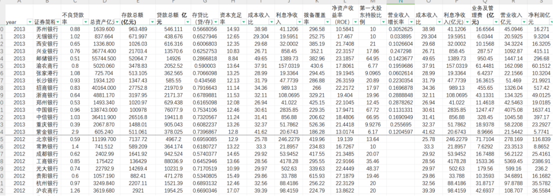 [3]包含21个常用财务指标:year、证券简称、不良贷款率、总资产、存款总额、贷款总额、存贷比、资本充足率、成本收入比、利息净收入、拨备覆盖率、净资产收益率、第一大股东持股比例、营业收入增长率、业务及管理费、营业收入、净利润、总资产净利率、净资产收益率、加权风险资产净额、加权风险资产比率
