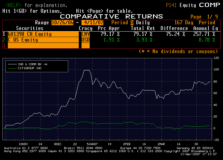 看一下中国的银行, 个别已经变成了上市公司。 他们长期从行政的角度来管理,透明度不高。但是国际市场却对这些银行的期望值甚高。请看图2, 工商行和Citigroup的比较。