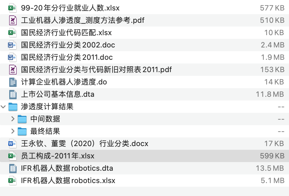 | 三、参考文献[1黄群慧,贺俊.中国制造业的核心能力、功能定位与发展战略——兼评《中国制造2025》[J].中国工业经济,2015(06):5-17. [2]王林辉,胡晟明,董直庆.人工智能技术会诱致劳动收入不平等吗——模型推演与分类评估[J].中国工业经济,2020(04):97-115. [3]刘斌,潘彤.人工智能对制造业价值链分工的影响效应研究[J].数量经济技术经济研究,2020,37(10):24-44. 四、数据概览数据用途:工业机器人渗透度测度(可参考方法说明)