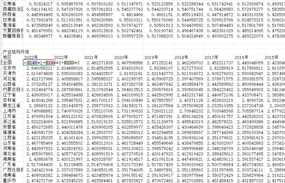 产业结构升级=第一产业比重*1+第二产业比重*2+第三产业比重*3