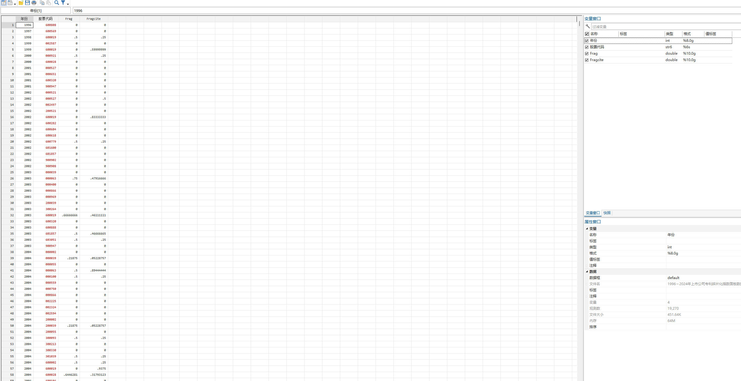 专利碎片化指数是衡量专利引用知识分散程度的重要指标,碎片化越高,越容易导致专利丛林问题。专利所有权的分散意味着用于保护复杂产品不同组件的专利由不同的主体所持有,要制造该产品就必须从所有不同的专利持有者那里获得这些专利的使用许可。因此,专利所有权的分散可能会阻碍相关专利技术的使用,不同专利所有者之间就整合分散的权利进行谈判也会产生高昂的成本。本数据包含Ziedonis(2004)方法计算的Frag指标和Noel and Schankerman(2013)方法计算的Fragcite指标。