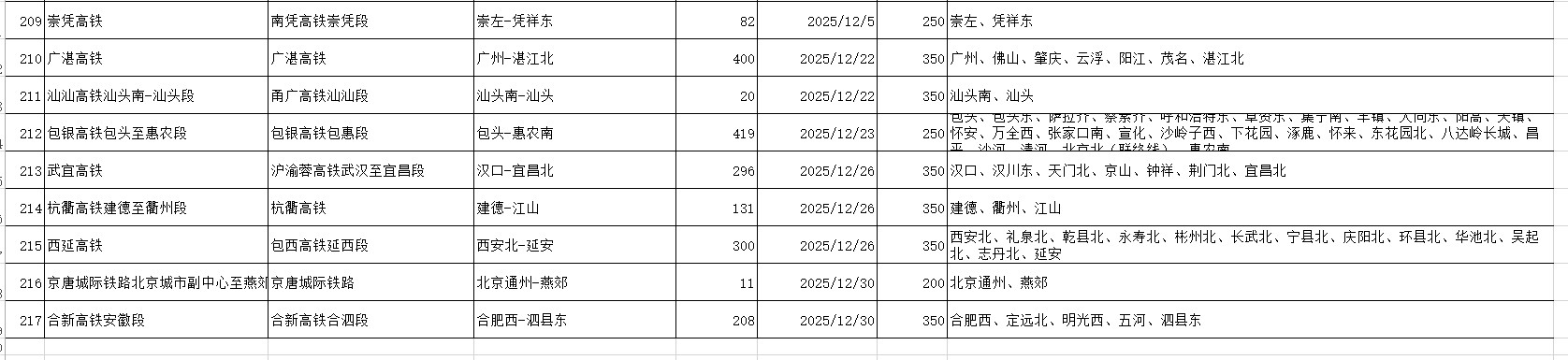 四、数据质量:由本表汇总计算的2003-2025我国高铁开通总里程为50977公里,与2025年12月26日交通部发布的“12月26日,随着西安至延安高铁开通运营,我国高铁营业里程突破5万公里”高度一致。