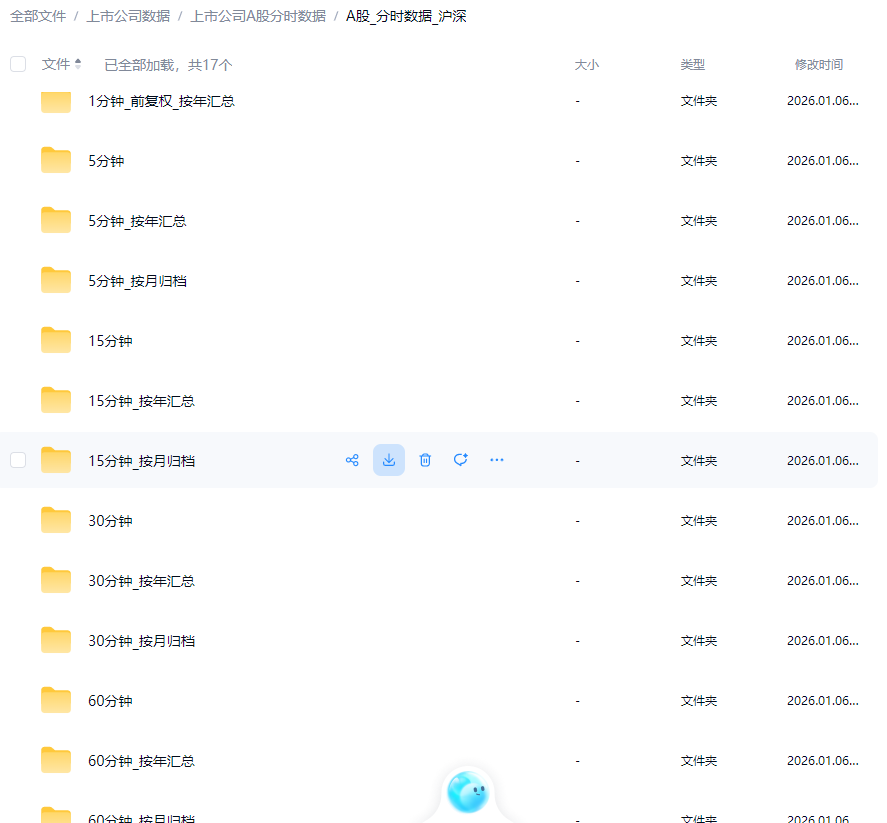 - 数据粒度:分钟级分时数据(1分钟/5分钟/15分钟/30分钟/60分钟)