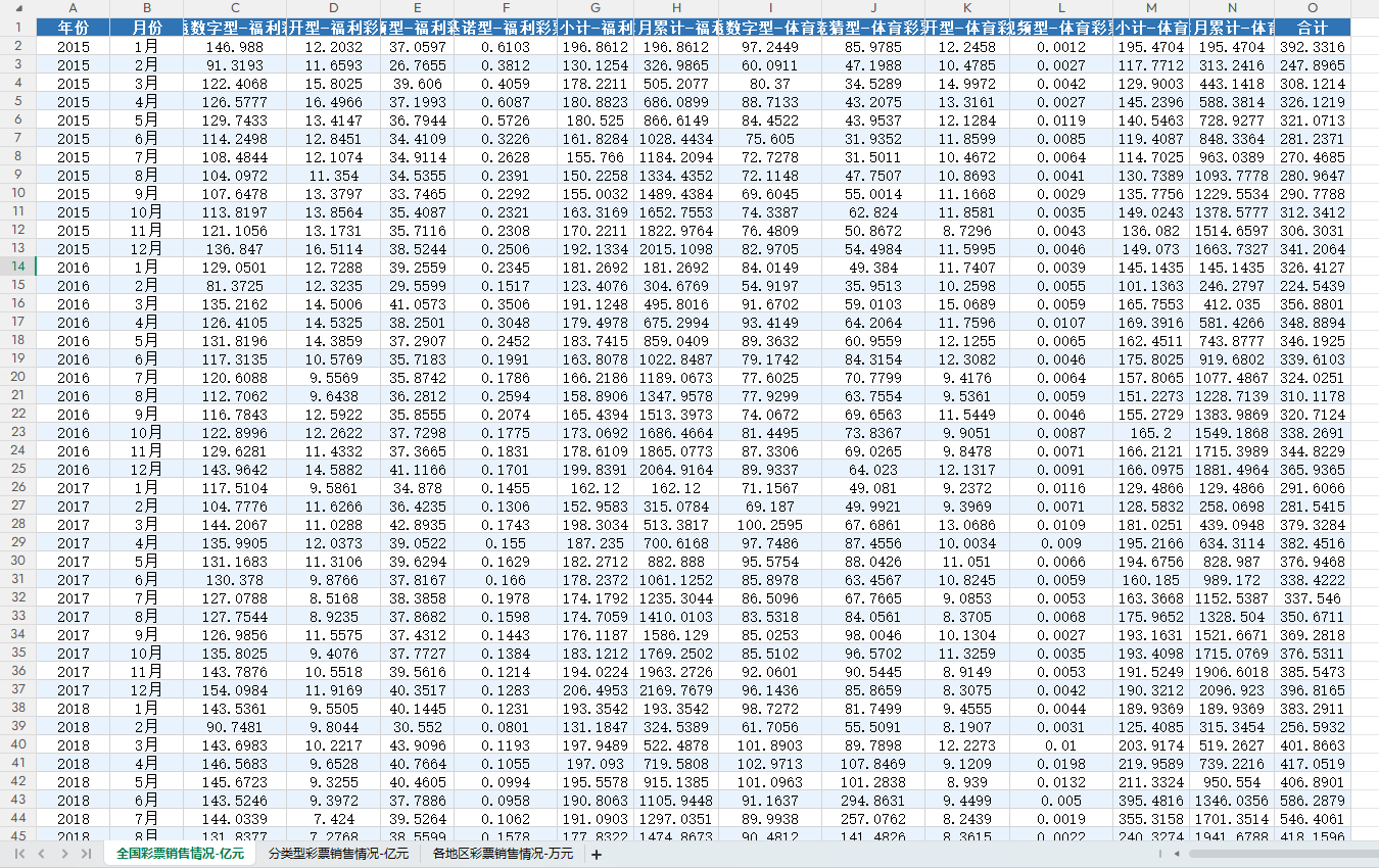 数据简介:本数据以贾晨和谢衷洁(2009)《中国福利彩票销售额影响因素分析与基于残差主成分分析的预测》的研究框架作为参考,收集整理了全国彩票销售表格。在我国社会经济格局中,彩票销售作为一个特殊的领域,长期处于公众视线的焦点与边缘之间——它既是一项年销售额数千亿元、直接关联数百亿公益金分配的重要经济活动,又常被简单贴上“赌博”或“运气游戏”的标签而缺乏深入审视。在共同富裕成为国家战略目标、社会保障体系持续完善、民众心理需求日益复杂的当下,系统探究全国彩票销售的多维意义,已超越单纯的产业研究范畴,成为理解当代中国社会经济生态的一个关键切口。从公共财政与第三次分配视角看,彩票研究是透视中国特色社会财富再分配机制的重要窗口;从社会心理学与行为经济学视角看,彩票消费行为是解码转型期民众心态与风险认知的独特样本;从法律伦理与公共治理视角看,彩票监管体系是国家治理能力在特定领域的体现;从文化研究视角看,彩票现象承载着丰富的民间文化意涵与集体叙事。