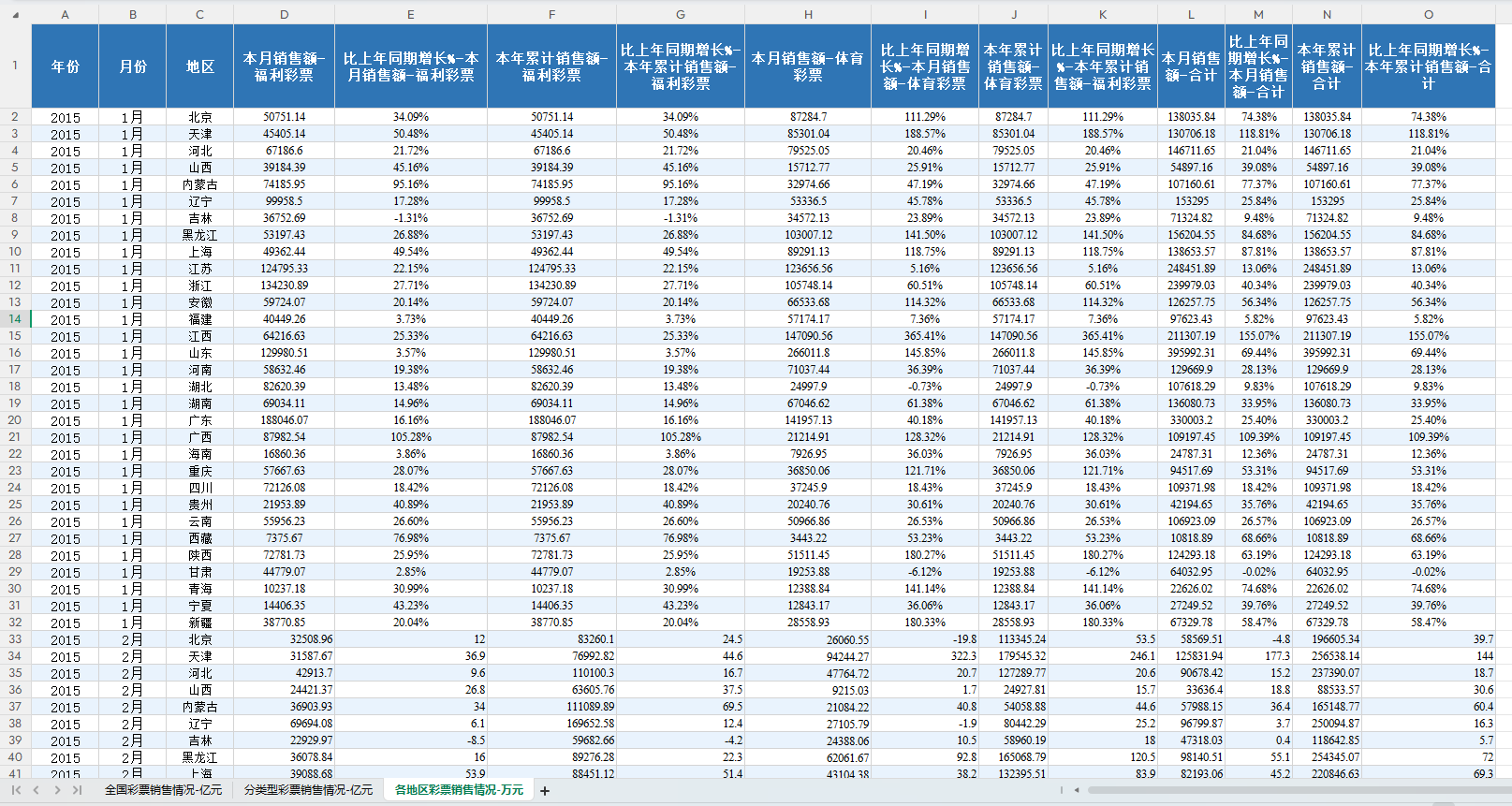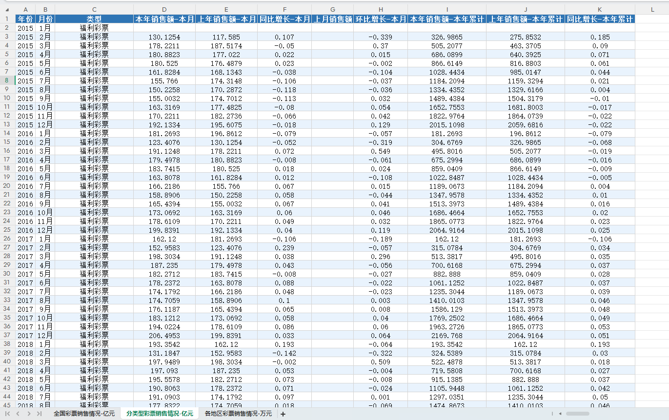 本月销售额-福利彩票 | 比上年同期增长%-本月销售额-福利彩票 | 本年累计销售额-福利彩票 | 比上年同期增长%-本年累计销售额-福利彩票 | 本月销售额-体育彩票 | 比上年同期增长%-本月销售额-体育彩票 |
