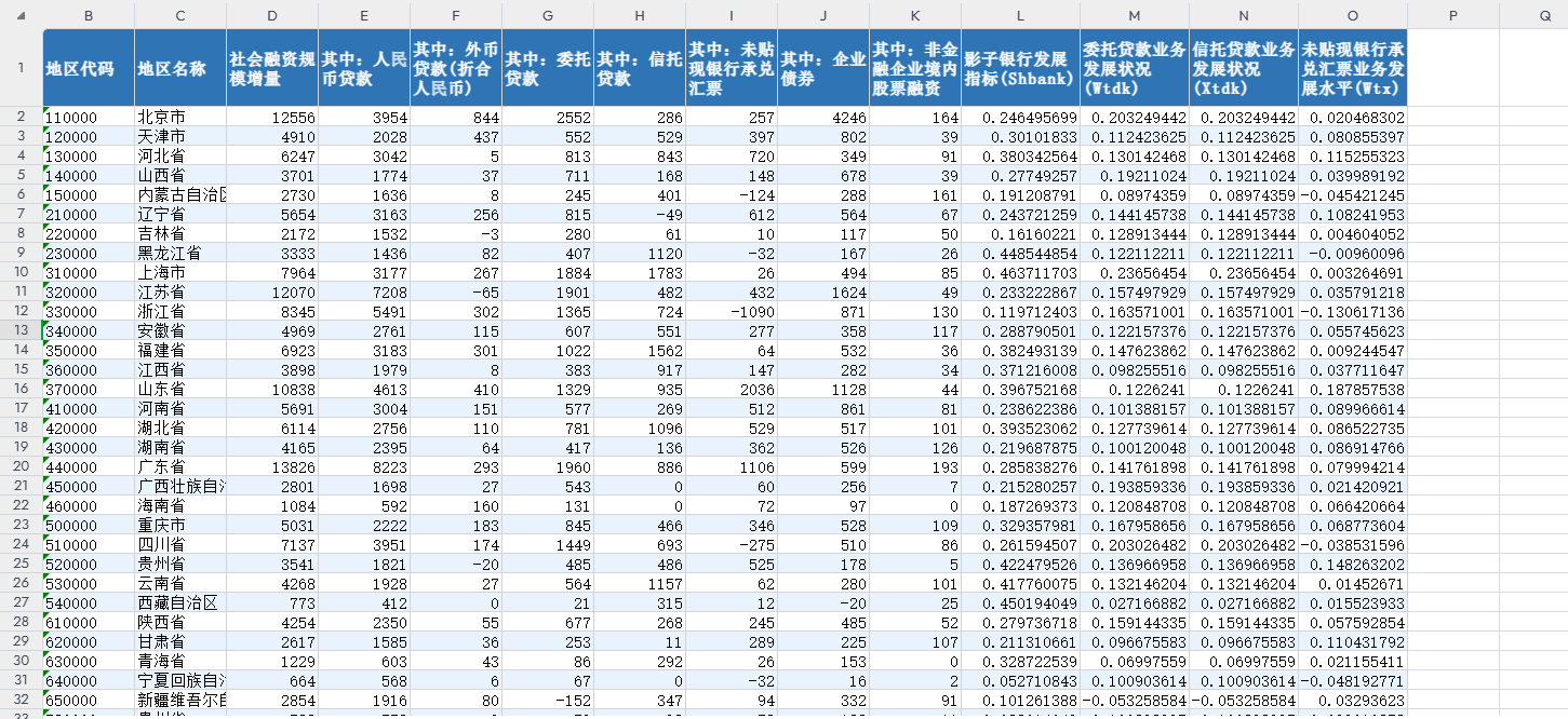 统计季度 | 地区代码 | 地区名称 | 社会融资规模增量 | 其中:人民币贷款 | 其中:外币贷款(折合人民币) | 其中:委托贷款 | 其中:信托贷款 |
