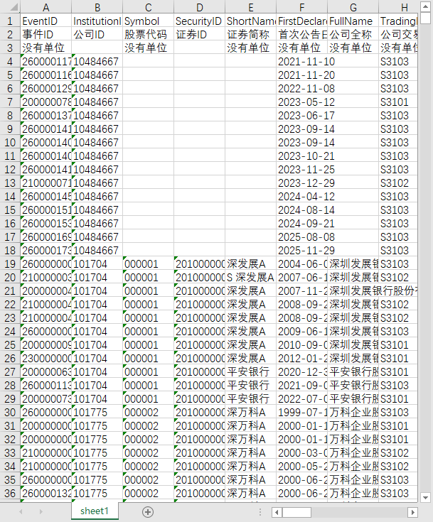 事件ID 公司ID 股票代码 证券ID 证券简称 首次公告日期 公司全称 公司交易地位 董事会决议日期 股东大会审议日期 证监会核准日期 协议签署日期 最新公告日期 完成公告日期 交易是否成功 重组类型 标的分类 卖方标的价值 买方支出价值 支付方式 是否关联交易 是否重大资产重组 第一大股东变更与否 交易涉及方 涉及方交易地位 涉及方企业性质 与上市公司关系 交易涉及方是否有上市公司 交易涉及方证券代码 交易概述