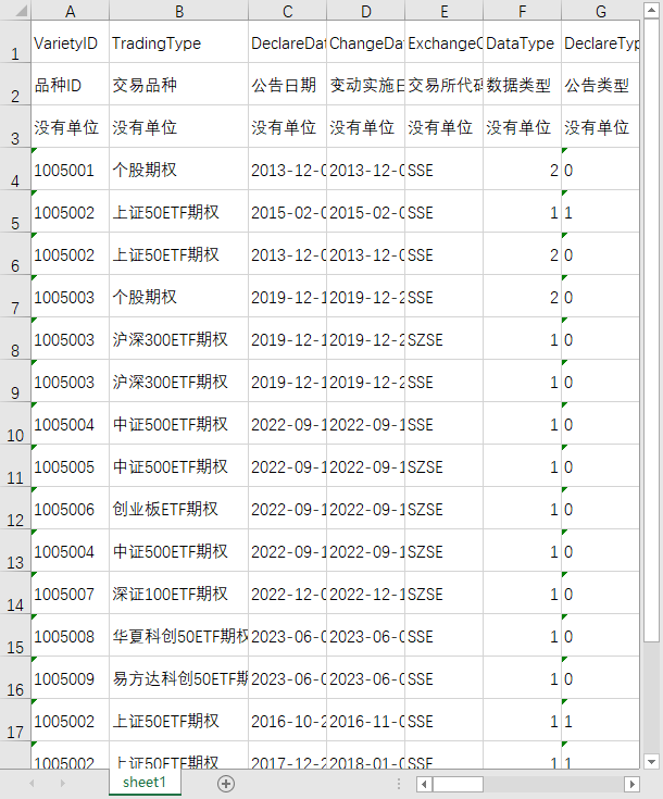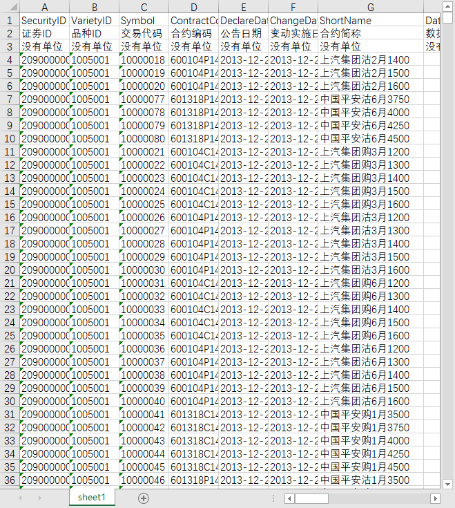 证券ID 品种ID 交易代码 合约编码 公告日期 变动实施日期 合约简称 数据类型 交易所代码 标的证券交易所代码 标的证券交易代码 标的证券简称 标的证券类型 挂牌基准价 首日上市日期 最后交易日 到期日 行权日 交收日 认购认沽 行权价 行权价格间距 合约单位 最小变动单位 合约月份 个人投机持仓限额 个人备兑开仓持仓限额 一般机构持仓限额 自营账户持仓限额 做市商持仓限额 自营商持仓限额 经纪商持仓限额