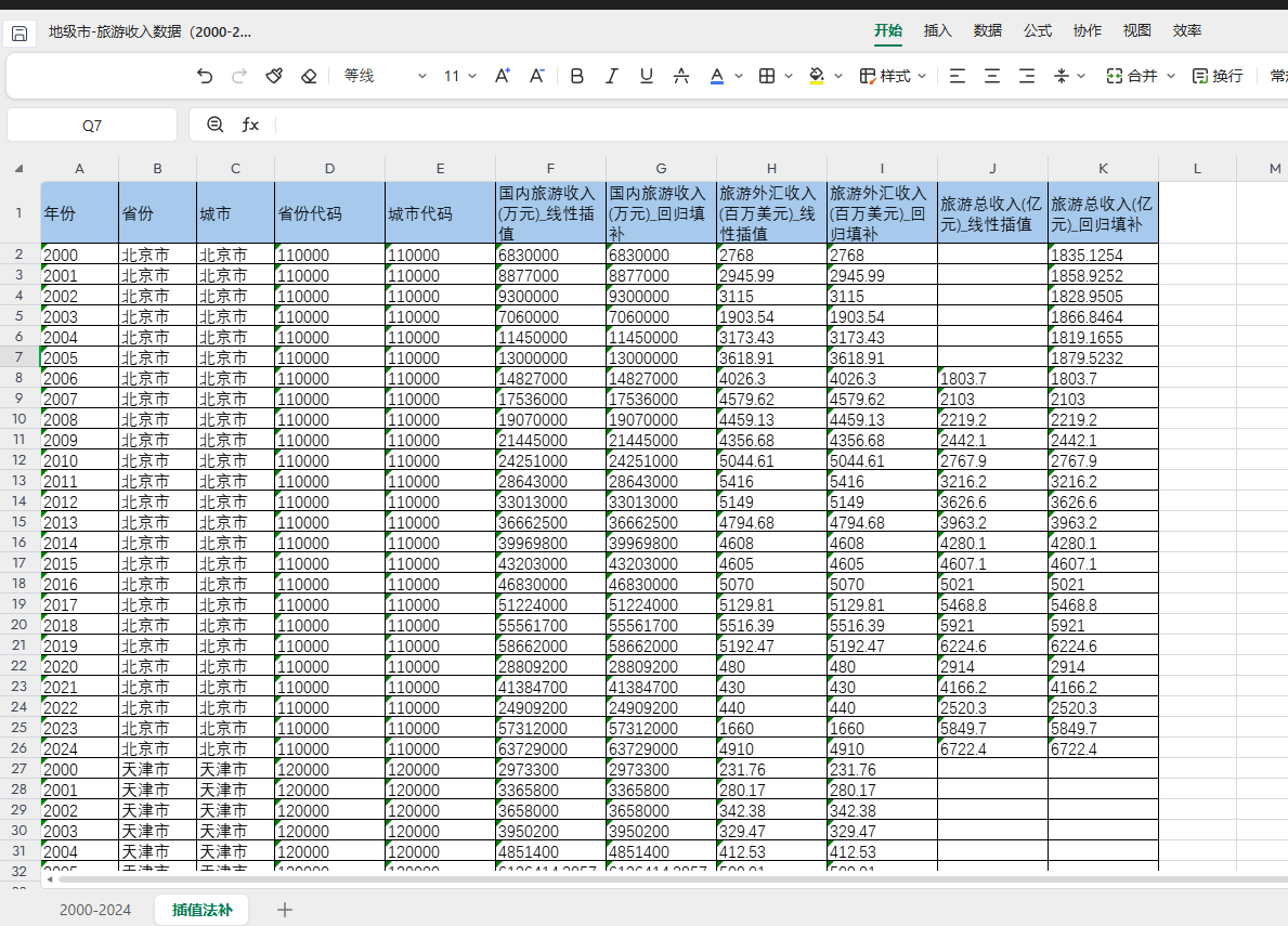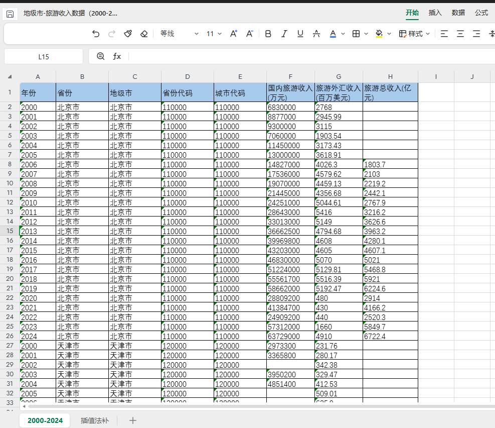 包含指标:年份 省份 城市 省份代码 城市代码 国内旅游收入(万元) 旅游外汇收入(百万美元) 旅游总收入(亿元) 国内旅游收入(万元)_线性插值 国内旅游收入(万元)_回归填补 旅游外汇收入(百万美元)_线性插值 旅游外汇收入(百万美元)_回归填补 旅游总收入(亿元)_线性插值 旅游总收入(亿元)_回归填补