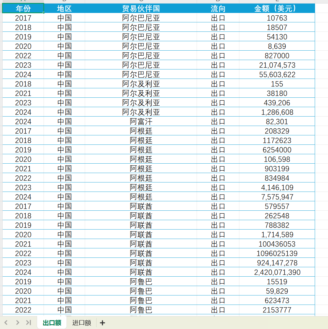 1、数据源名称:中国与世界各国新能源汽车进出口数据(2017-2024年)