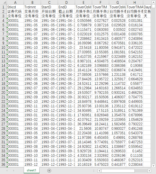 证券代码 交易月份 开始日期 截止日期 月换手率(流通股数)(%) 月换手率(总股数)(%) 日均换手率(流通股数)(%) 日均换手率(总股数)(%) 交易天数 市场类型 交易状态