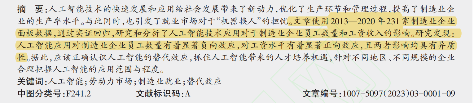 [1]孙文远,刘于山.人工智能对劳动力市场的影响机制研究[J].华东经济管理,2023,37(03):1-9.