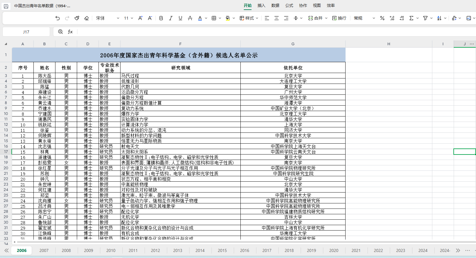 数据简介:国家杰出青年科学基金是我国在基础研究领域为优秀青年学者提供的最高层级人才资助项目。该基金专项用于支持已取得显著科研成果的青年学者,资助其自主开展创新性研究工作,着力培养一批能够跻身世界科技前沿的学术领军人才。本数据集全面、系统地收录了1994年至2024年间所有获得该基金资助的学者信息。数据内容详尽,包括获资助学者的姓名、性别、学位、专业技术职务、主要研究领域及其依托的科研单位等关键信息。通过该数据集,可完整呈现近三十年来我国高层次科研人才队伍的结构特征与学科分布状况,为深入探究科技人才成长规律、科学评估科研机构竞争力以及准确把握学科发展趋势提供了权威且坚实的基础数据支撑。