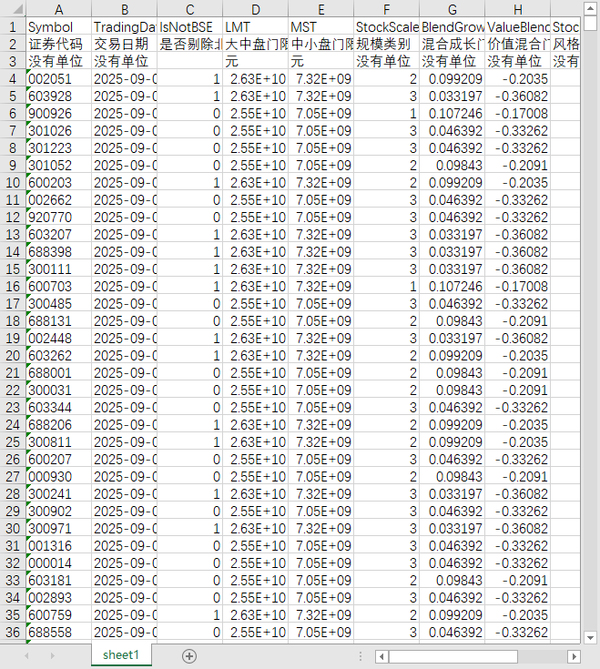 证券代码 交易日期 是否剔除北交所股票 大中盘门限值 中小盘门限值 规模类别 混合成长门限值 价值混合门限值 风格类别 价值成长定位 规模定位