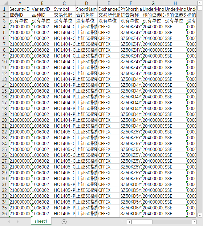 证券ID 品种ID 交易代码 合约简称 交易所代码 拼音简称 标的证券ID 标的证券交易所代码 标的证券交易代码 标的证券名称 标的证券简称 标的指数分类编码类型 标的指数类型 挂牌基准价 首日上市日期 最后交易日 到期日 行权日 交收日 认购认沽 行权价 合约月份 数据类型