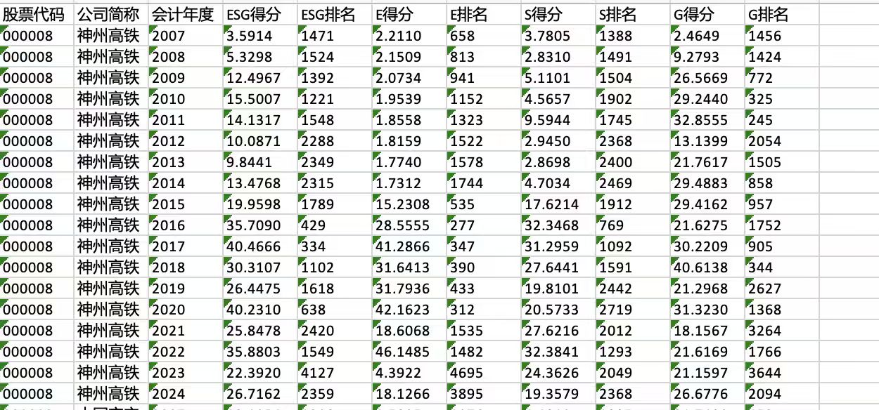 2.测算方式:参考《经济研究》严兵(2024)老师的做法,将 ESG 评价指标细分为环境(E)、社会(S)和公司治理(G)三个独立维度进行测算,具体指标为 股票代码 公司简称 会计年度 ESG得分 ESG排名 E得分 E排名 S得分 S排名 G得分 G排名