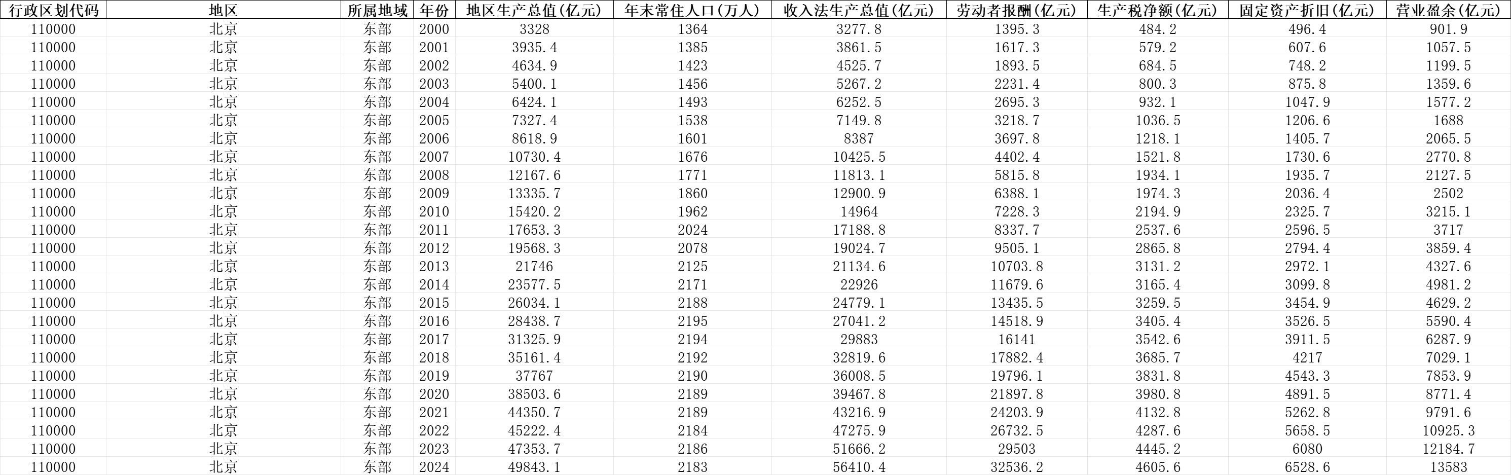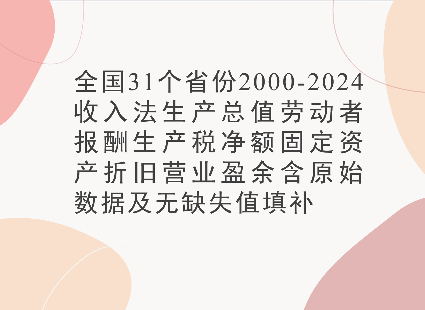全国31个省份2000-2024收入法生产总值劳动者报酬生产税净额固定资产折旧营业盈余含原始数据及无缺失值填补