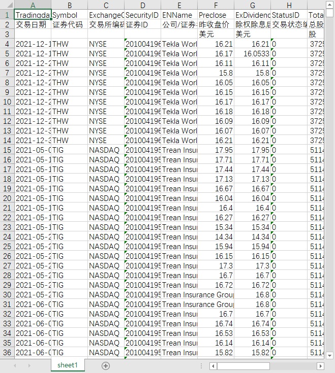交易日期 证券代码 交易所编码 证券ID 公司/证券名称 昨收盘价 除权除息后的前收盘价 交易状态编码 总股本 流通股本 每手股数 截止日期 每股净资产 每股收益 摊薄每股收益