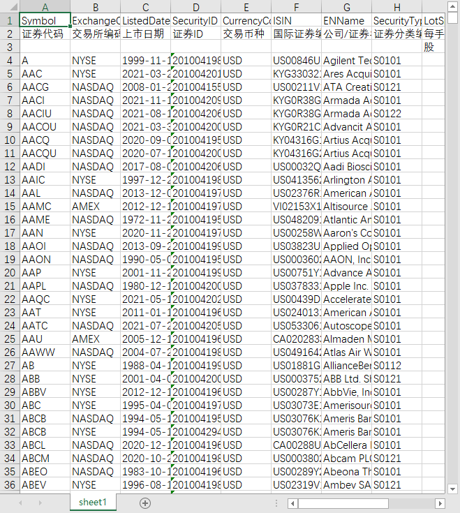 证券代码 交易所编码 上市日期 证券ID 交易币种 国际证券编码 公司/证券名称 证券分类编码 每手股数 公司分类 ETF标识 交易状态