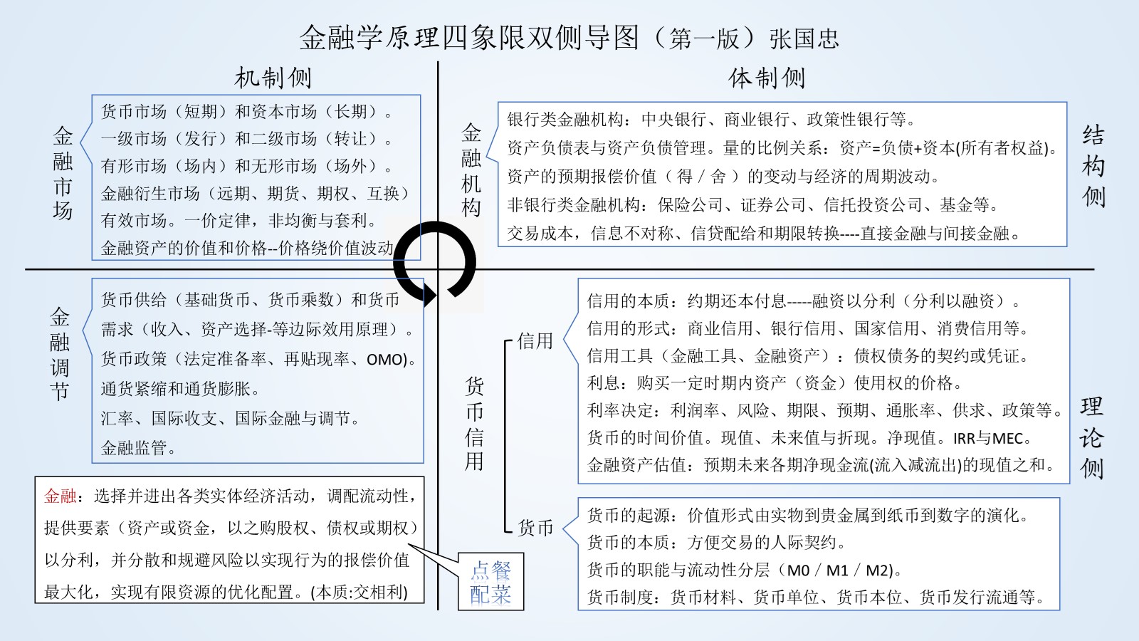 现在代课货币银行学,也给学生写了一个《金融学原理四象限鸟瞰图》,便于学习理解和复习用。