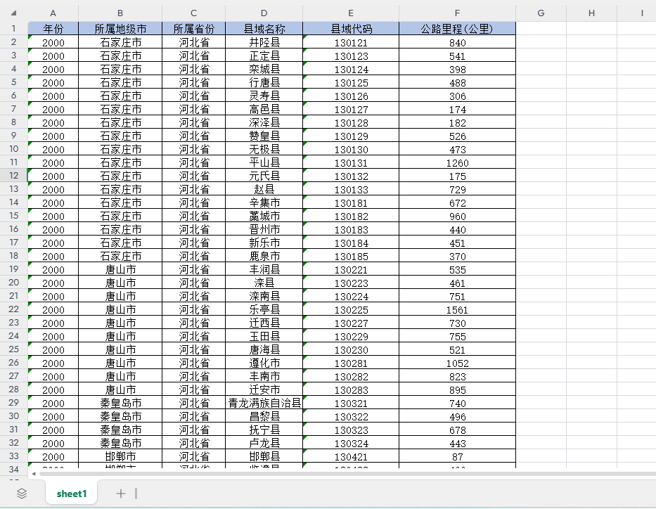 年份 所属地级市 所属省份 县域名称 县域代码 公路里程(公里)