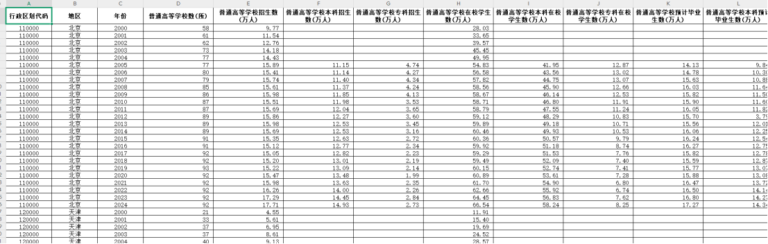 数据名称:2000-2024年全国各地区-教育139个相关指标
