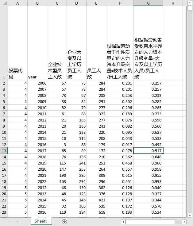 股票代码 year 企业技术型员工人数 企业大专及以上学历员工人数 员工人数 根据据劳动者工作性质界定的人力资本升级变量=技术人员/员工人数 根据据劳动者受教育水平界定的人力资本升级变量=大专及以上学历人员/员工人数