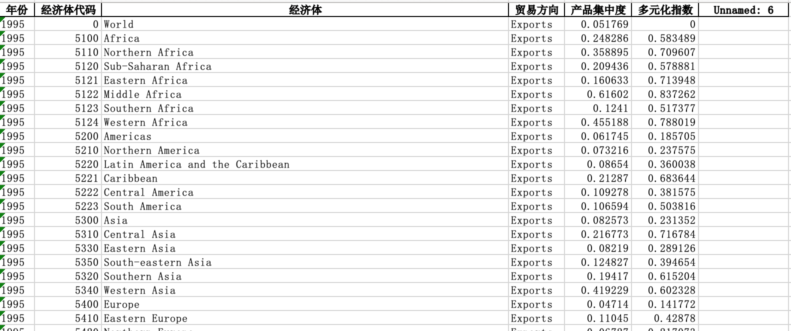 数据指标:年份、经济体代码、经济体、贸易方向、产品集中度、多元化指数