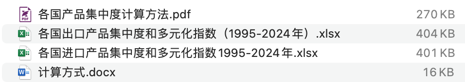 本数据来源于联合国贸发会议统计局(UNCTAD),以三位数国际贸易标准分类(修订版3)为统一分类口径,经规范化测算处理,最终得到全球250余个国家1995-2024年的进出口产品集中度及多元化指数数据集,以期为国际贸易领域的学术研究与相关政策分析提供标准化数据支撑
