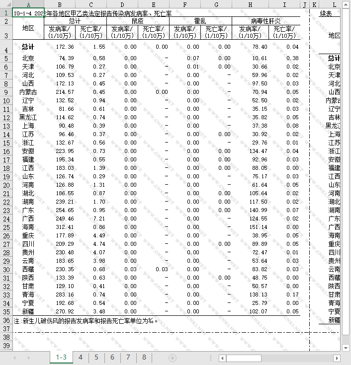 全国各地区31省份甲乙类法定报告传染病发病率死亡率2005-2023鼠疫霍乱病毒性肝炎甲乙丙丁各类型肝炎艾滋病淋病狂犬病肺结核新冠等