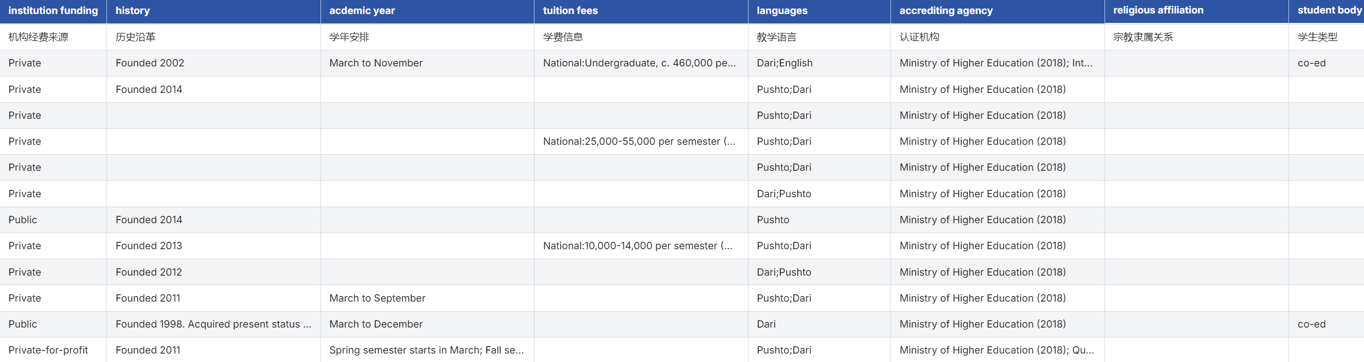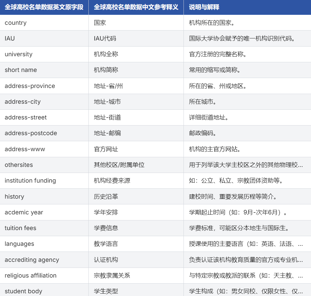 统一标识与多源信息整合:每个机构均包含IAU(国际大学协会)唯一识别代码,便于与国际教育数据库对接。同时,“其他校区/附属单位”“学术期刊”“主要出版社”等字段提供了高校学术生态的延伸信息,支持机构网络与学术影响力分析。