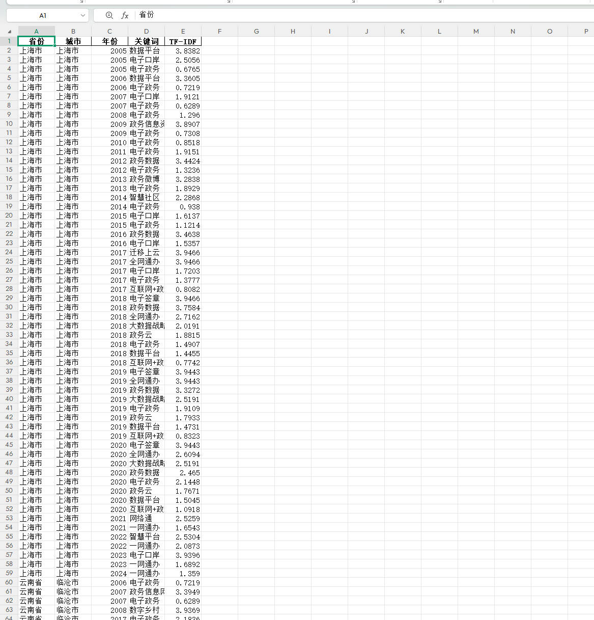 - ln[tfct(θ)+1]:城市c在第t年《政府工作报告》中关键词θ的统计词频(TF)