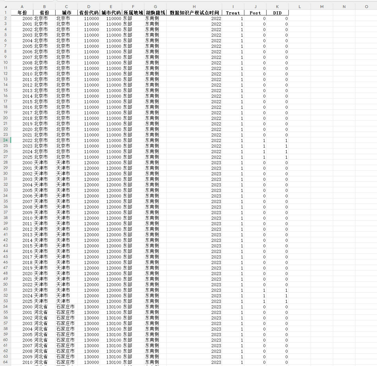 - Treat:处理组虚拟变量(1=试点地区所属城市,0=非试点地区城市)